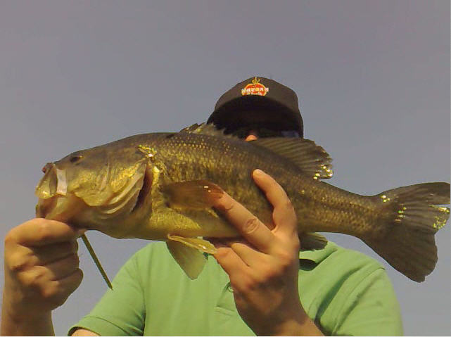 Superficie invasa da erbai galleggianti, monto craw 4" su jig head, che tra gli ostacoli si disbriga mica male. Due lanci arriva subito un bass da 33cm, degno di nota visto che gli usciva dallo stomaco un lunghissima antenna di gambero!! ( e si voleva mangiare pure il mio...ma dove lo mette!!!) Altro lancio sopra erbaio, cade in acqua e mostruosa partenza dall'erbaio vicino di un bell bass da 40 cm ... lotta notevole salta di qua e di la e riparte, viene su... scatto e ...arrivederci.