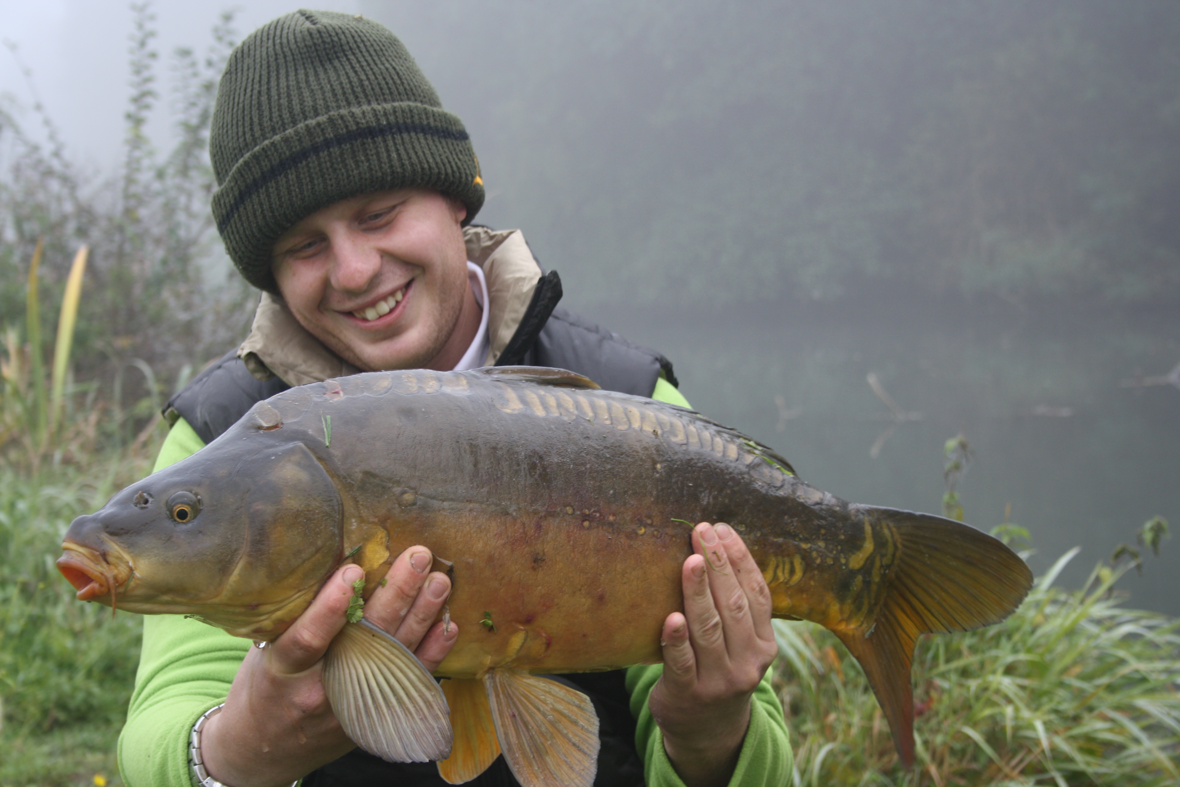 Nel frattempo la nebbia inizia a dissolversi cosi zambo e gian decido di lanciare le ultime due canne... Gian lancia e dopo 3 secondo partenza a razzo e porta una guadino un'altra bella carpa.