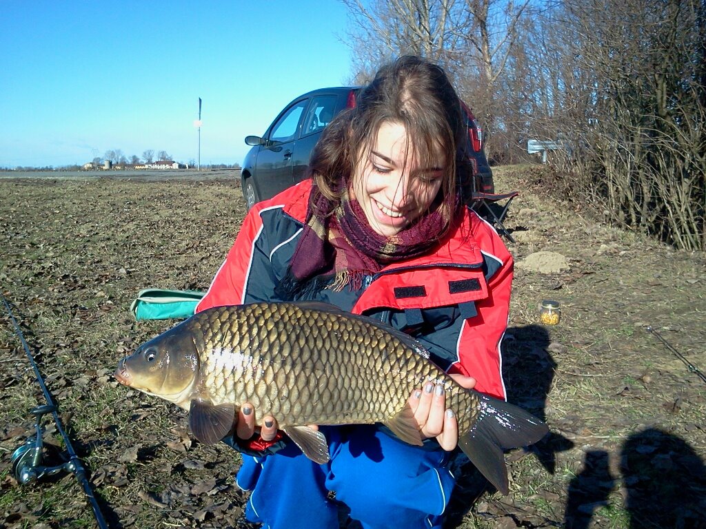 In questi ultimi giorni sono andato a far visita a una buca di un piccolo fosso che frequentavo un paio di anni fa e che ho abbandonato per il nostro grande fiume, il Lambro. Decido una mattina di andare in esplorazione e capire se ci sono ancora carpe: armato solo di occhiali polaroid mi reco sul posto e una volta li riesco a scorgere nel sotto riva qualche bella carpotta. Decido allora di provare un paio d'ore dopo pranzo. Montata l'attrezzatura e lanciate le lenze in acqua, anche se l'ombra degli alberi non mi permette di vedere bene come la mattina, noto molte bolle provenienti dal fondo. Una leggere pasturata a mais a neanche un metro da riva dove la mattina avevo visto i ciprinidi e dopo non molto ecco la prima mangiata: un bel combattimento in questa spettacolare buchetta di circa 60 mt quadri il cui unico ostacolo è un tronco che sale dal fondo e dove ogni carpa cerca di intanarsi per sfuggire alla cattura. Dopo nemmeno 5 min ecco che ne parte un altra e questa volta mangia con più decisione: altra bella sfida per cercare di non perdere la regina sotto il legno ma che alla fine riesco a portare a guadino. Torno il giorno dopo e accade la stessa identica situazione: dopo poco tempo prima partenza e subito dopo il rilascio ecco l' altra partenza: altre 2 belle reginotte. Infine ieri ho tentato la fortuna andando con la mia ragazza, un oretta prima di pranzo nonostante il forte vento. Preparo tutto o quasi: mi sono dimenticato il pod a casa ma niente problemi: le canne le posso lasciare appoggiate a terra sulla riva. Il vento è fortissimo e la poca corrente che c'è porta sulle lenze moltissima sporcizia e decido quindi di tenere una canna in mano così da poter sentire meglio una possibile abboccata: proprio quando arriva una raffica di vento molto forte la canna che era a terra si sposta e sembra finire in acqua così la prendo in mano ma nel tirarla su mi accorgo che c'è qualcosa che tira! Passo la canna alla ragazza e io discendo la riva per guadinarla: in neanche 2 minuti riesci a portarla a tra le maglie del retino e dopo la foto di rito le ridoniamo la libertà.