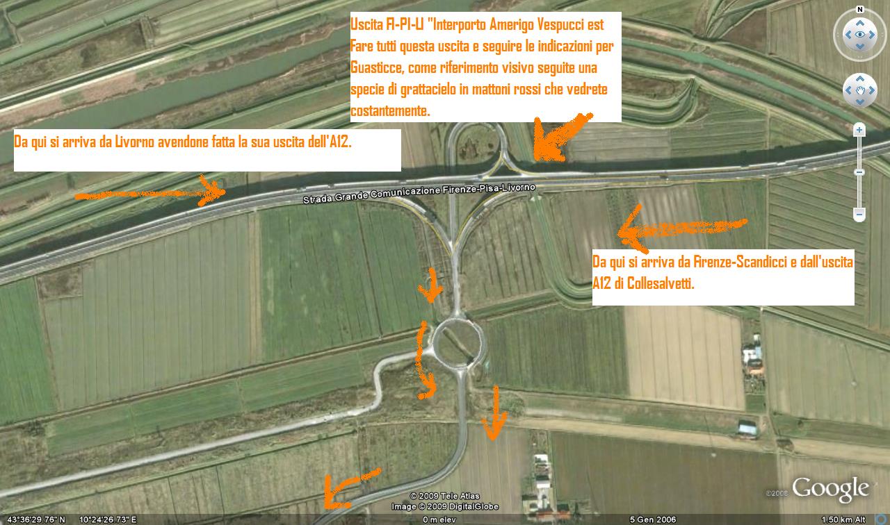Per chi invece arriverà da Firenze dovrà uscire dall'A1 a Firenze-Scandicci e tenendo la destra si immetterà immediatamente sulla stessa superstrada seguendo indicazioni Livorno e arriverà nella stessa confluenza di chi proverrà dall'A12 all'altezza di Collesalvetti.
