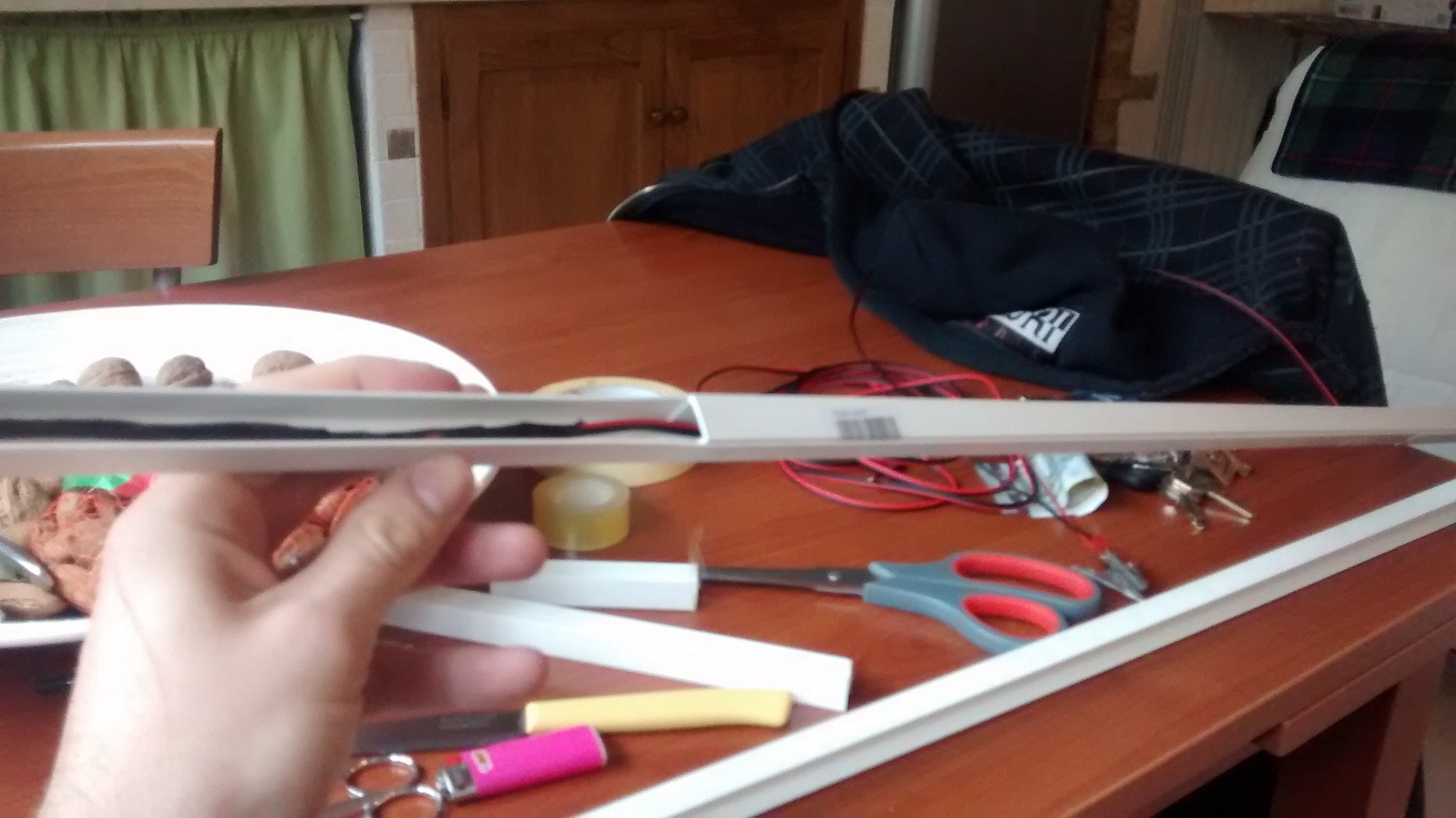 -2 barre di plastica da un metro ciascuna (quelle incave quadrate) (2,30€ l'una) una dovra essere messa allìinterno dell'altra per coprire i fili!