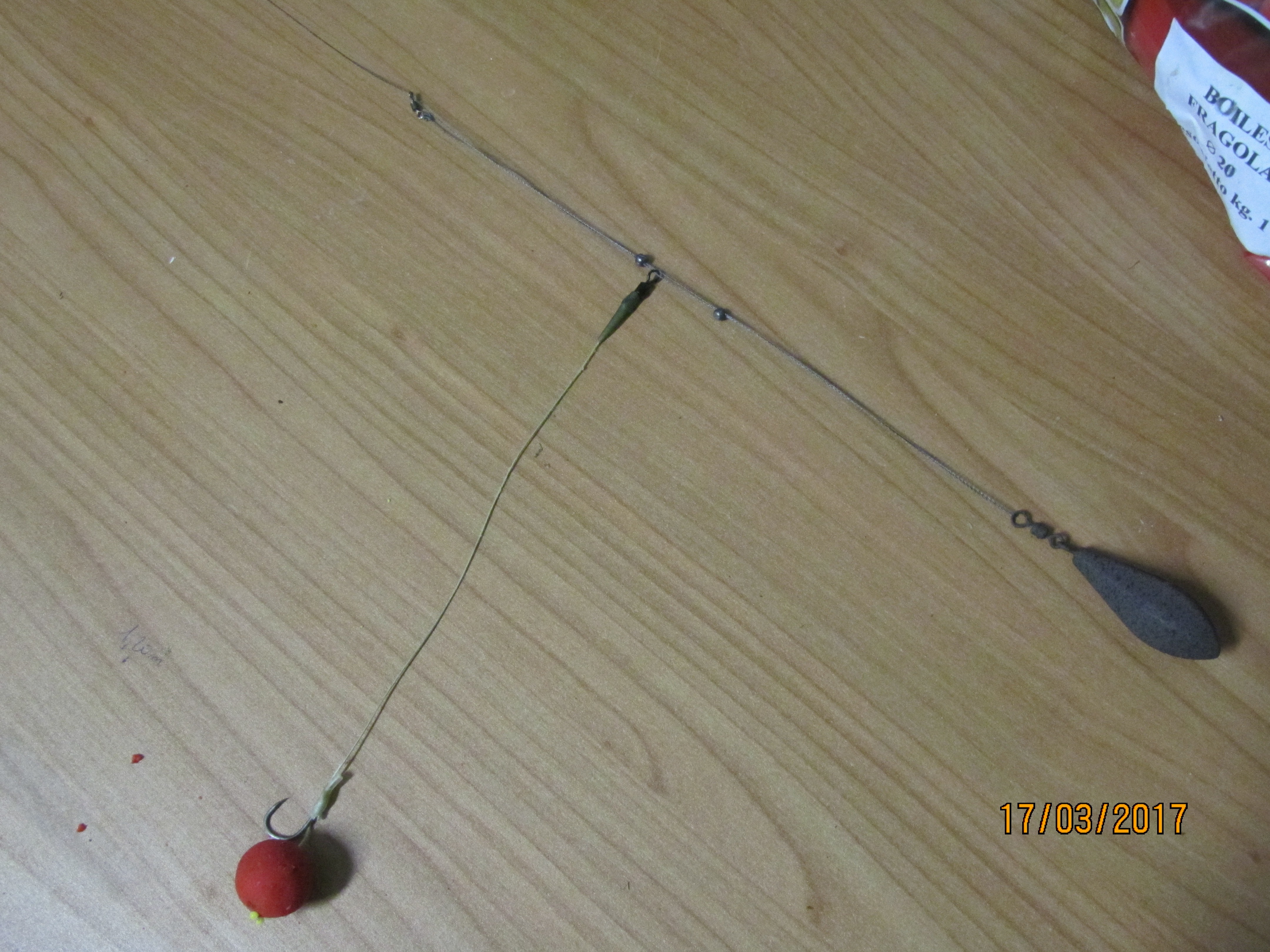 è composta da treccia o qualsiasi filo, lenza madre "GIRATA" nella girella, inserire piombo e rig (nella foto e nel video non va bene il rig, perché è troppo lungo, e la boiles, perché è affondante), piombini per fermare il rig (che nell'abboccata si staccano, si vede nel video...)