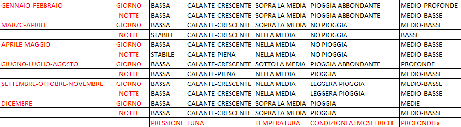 OVVIAMENTE NON E' UNA TABELLA DA PRENDERE ALLA LETTERA MA CREDO POSSA ESSERE MOLTO UTILE PER SCEGLIERE LA POSTAZIONE E IL MODO DI PESCARE