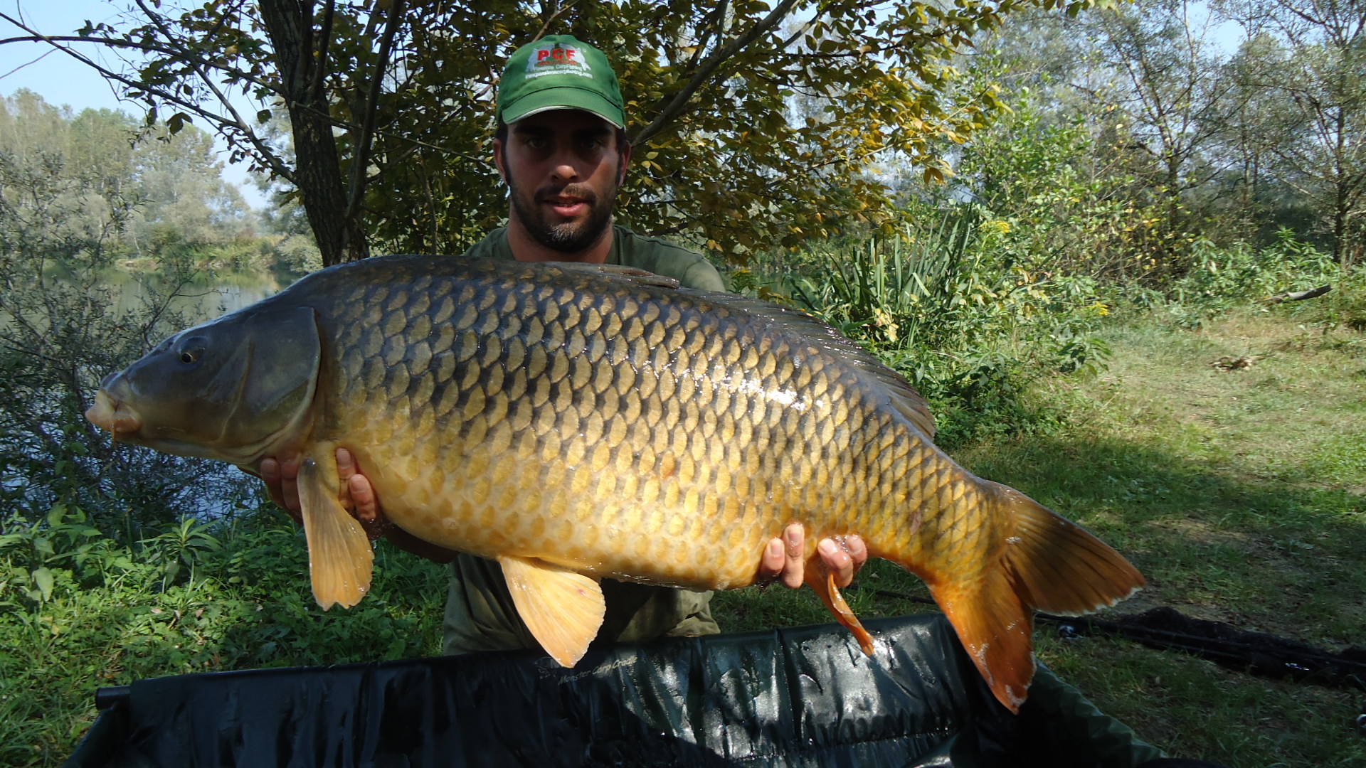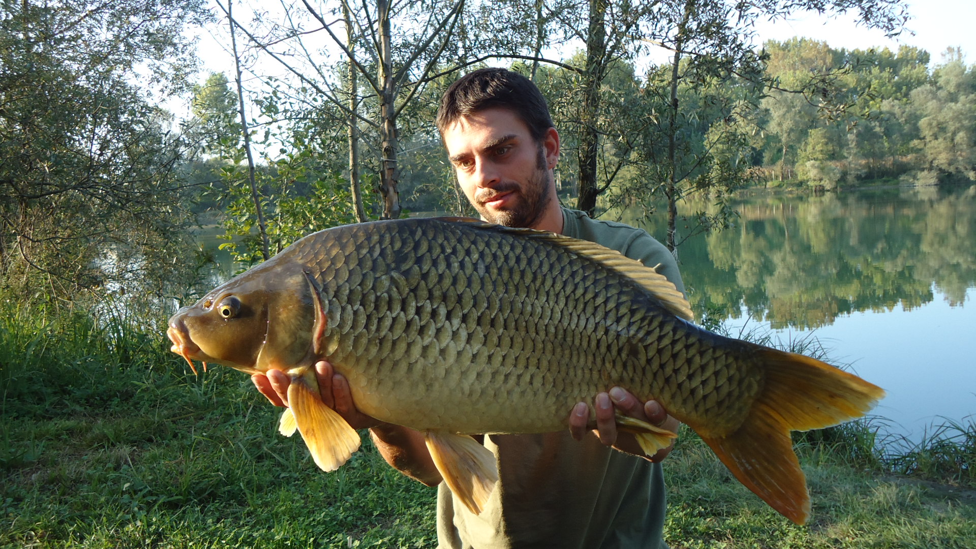 Sveglia alle sette si carica la macchina e sono le sette e trenta, ero indeciso se prendere il materassino piccolo o il monster crandle, mi sono detto proviamo con il nash, non potevo fare scelta piu' adatta, partenza alle sette e quaranta circa, arrivo al lago alle otto, il paesaggio era paradisiaco, foschia bassa sull'acqua e baffute che saltavano ovunque, monto tutto e sono le nove , prima canna ok seconda terza e quarta ok, sono le 10 circa allora prendo un caffe mangio la banana e in sottofondo sento un rumore familiare.. era proprio la frizione della canna sul picchetto lontana cavoli mi ero dimenticato l'avvisatore , corro ferro e sento come una zavorra lenta a venire, penso sia un tronco ma poi spunta in superficie eccola bellissima una reginona da 21.7 kg che bello! tutto entusiasta procedo foto di rito e rilascio, ma dopo circa un'ora sento un bip assordante eccola li la seconda regina questa era 17,5 kg niente male come giornata chiusa poi con l'ennesima regina questa volta di 9 kg insomma una giornata da record!