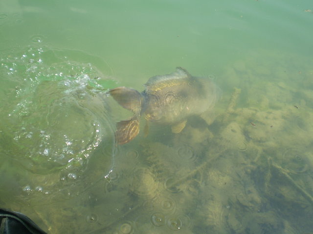 Verso le 11 passa un ragazzo che sta facendo il giro del lago pescando (e rilasciando ovviamente!) boccaloni. A un certo punto, dopo due chiacchere (ci racconta che poco prima alla punta hanno preso una 20kg) ci salutiamo. Passano 2 minuti e ci chiama a circa 30 mt dalle nostre postazioni per indicarci una carpa che nuotava tranquilla nel sottoriva.