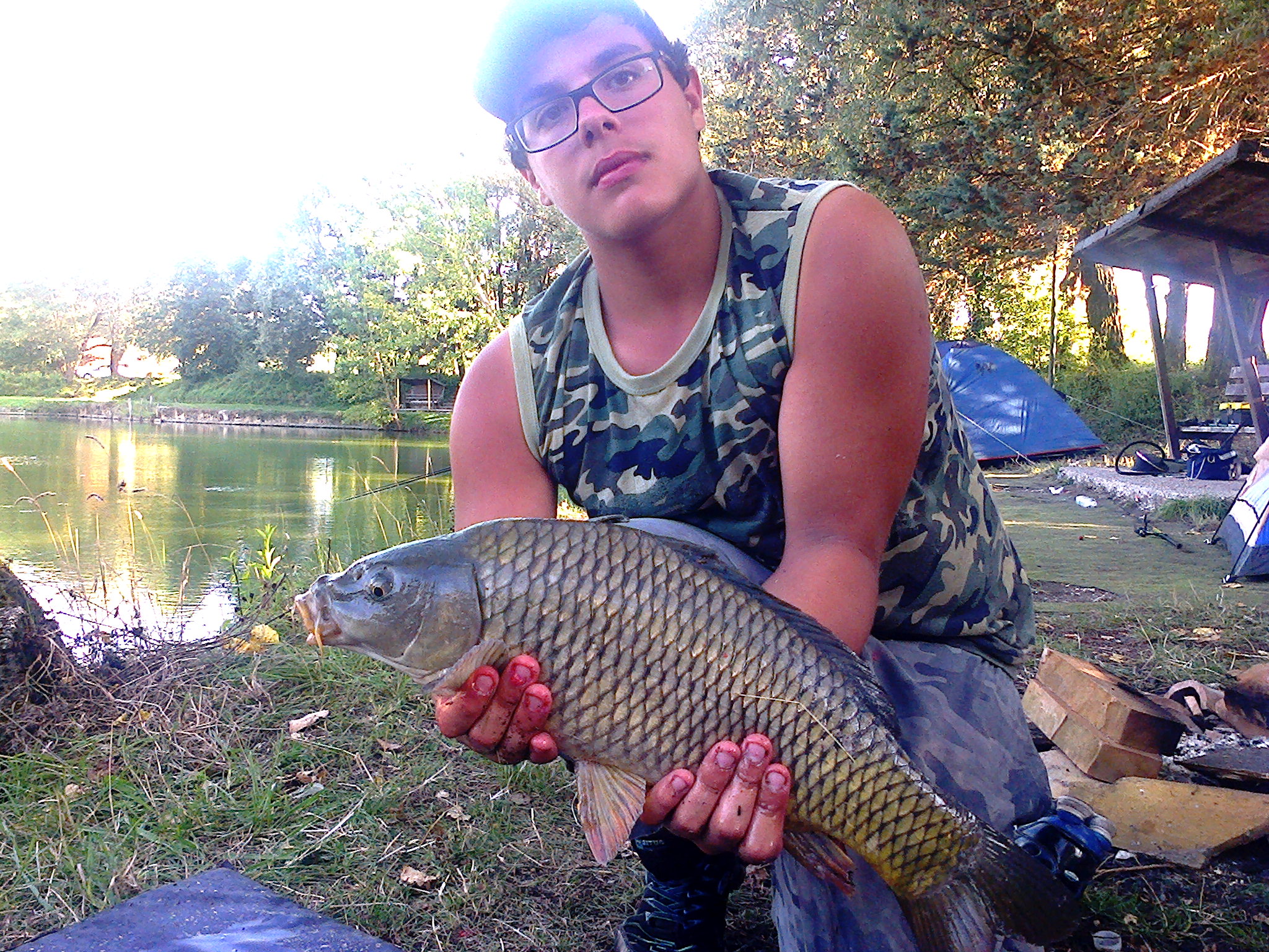 alle 2:30 di notte un'altra partenza mi va saltare giù dall' letto corro verso le canne ferro e sento stavola una carpa molto lenta e forte che dopo un bel pò si stanca e si lascia guadinare (purtroppo nel cuore della notte tutti dormivano quindi ho dovuto fare tutto da solo e mi scuso se la foto non è il massimo):
