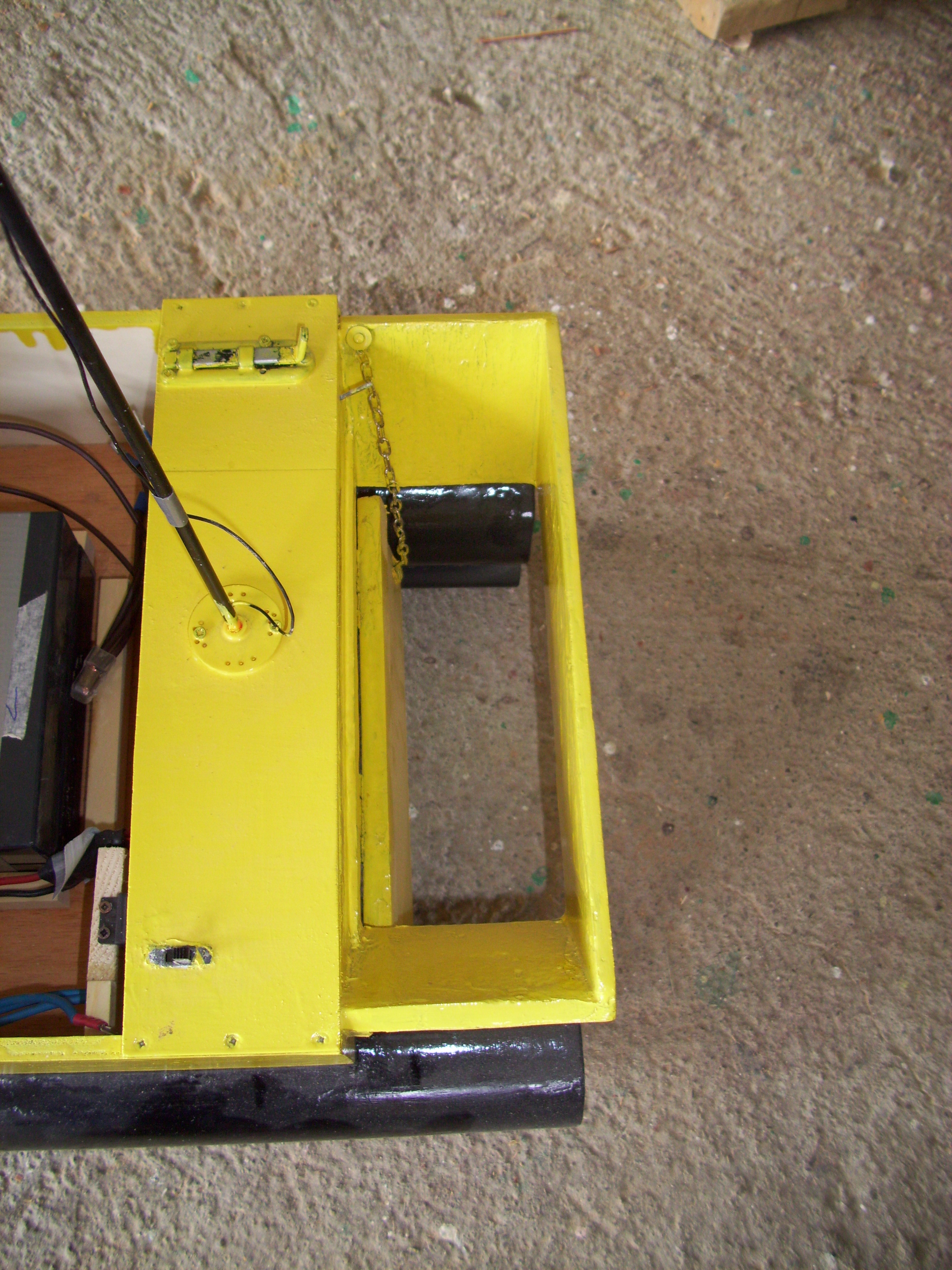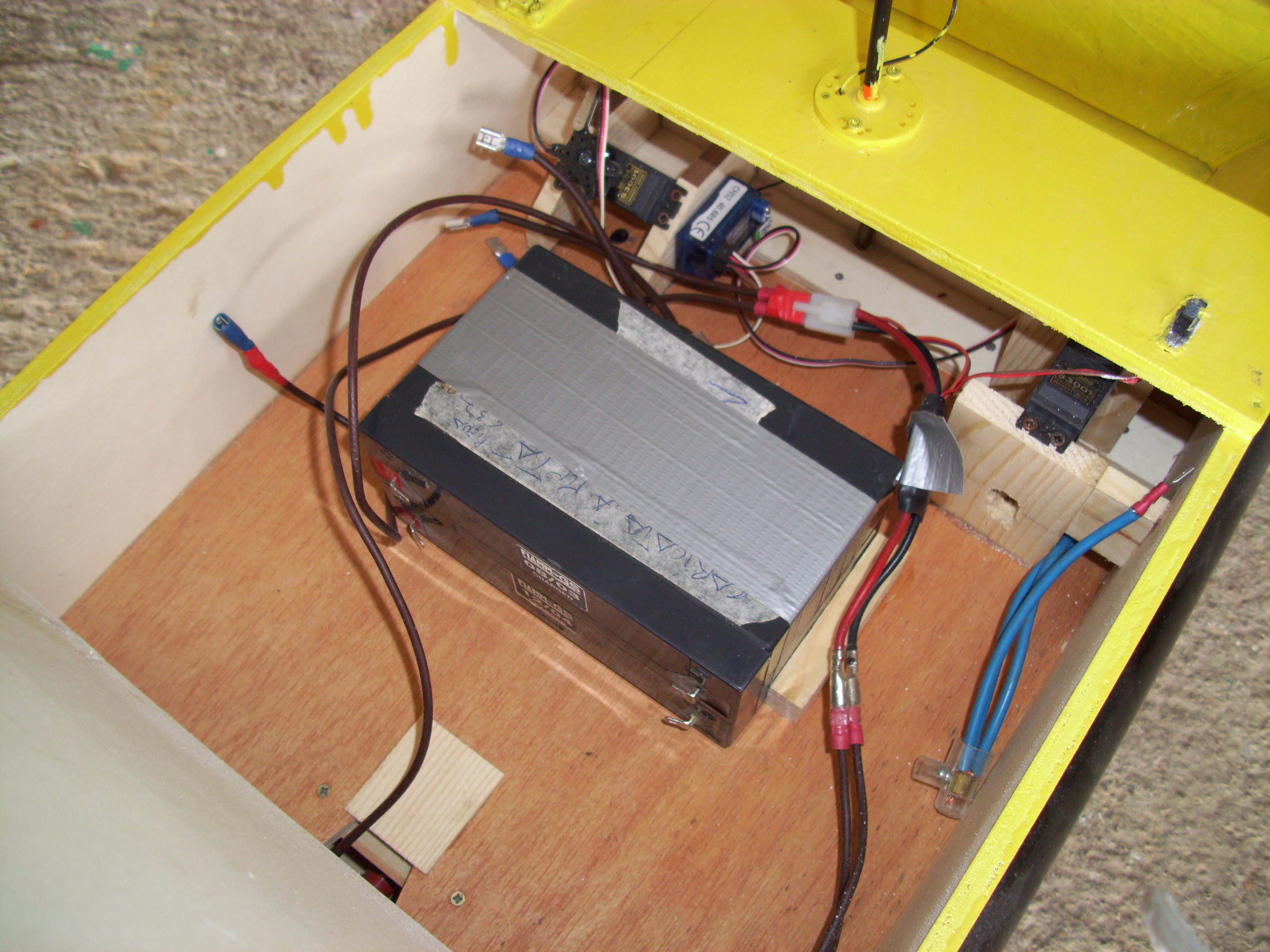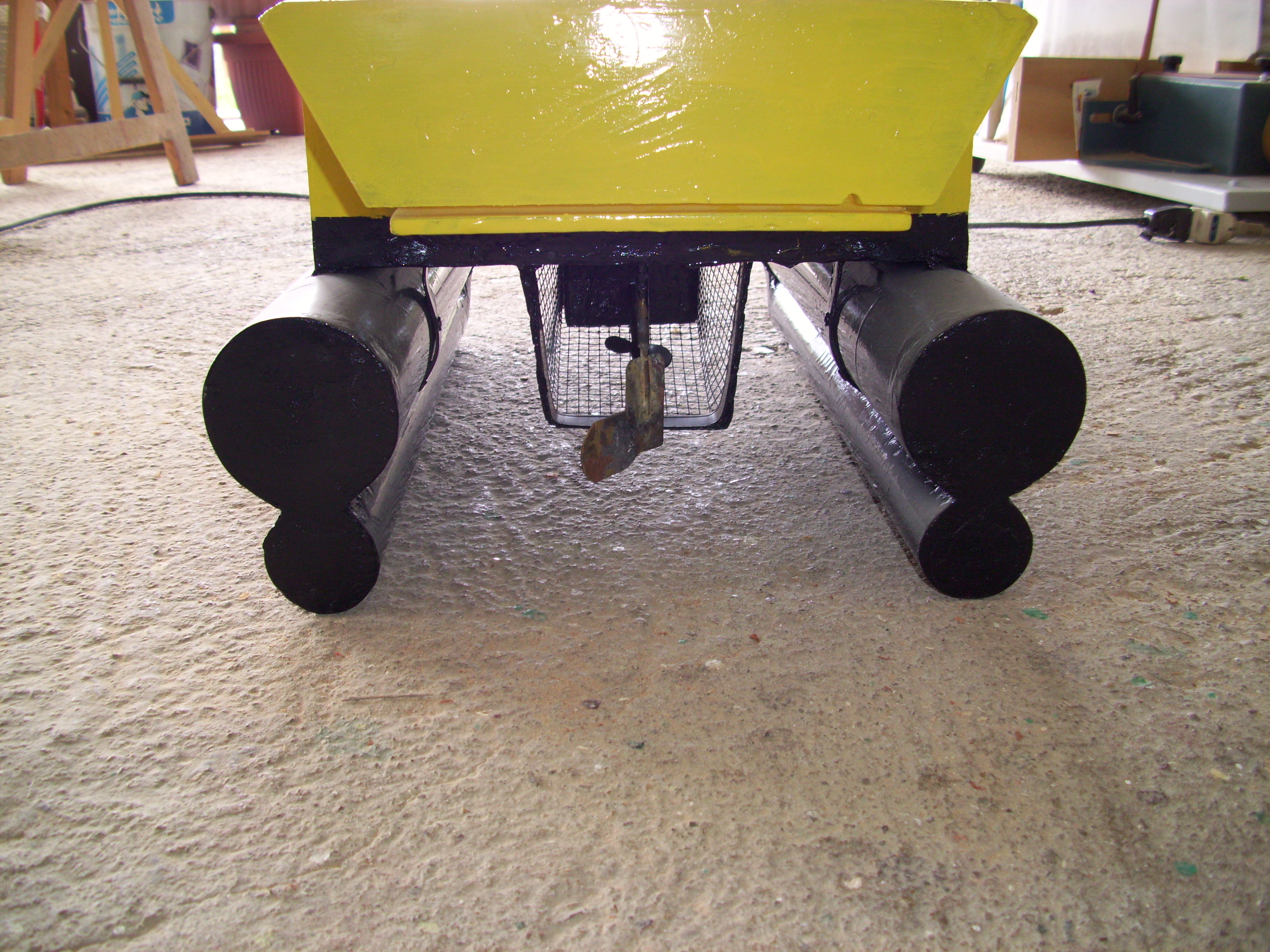 Il secondo è un pò piu semplice nella costruzione. Il cuore del barchino è sempre in legno rivestito di vetroresina e poi verniciato, ma la parte inferiore è fatta con i classici tubi arancioni da edilizia e poi verniciati. Ha solamente una vasca anteriore che porta 1kg di boilies e l'elica rivestita con rete metallica. A differenza del primo ha più autonomia perche funziona con 2 batterie da 6v unite insieme.