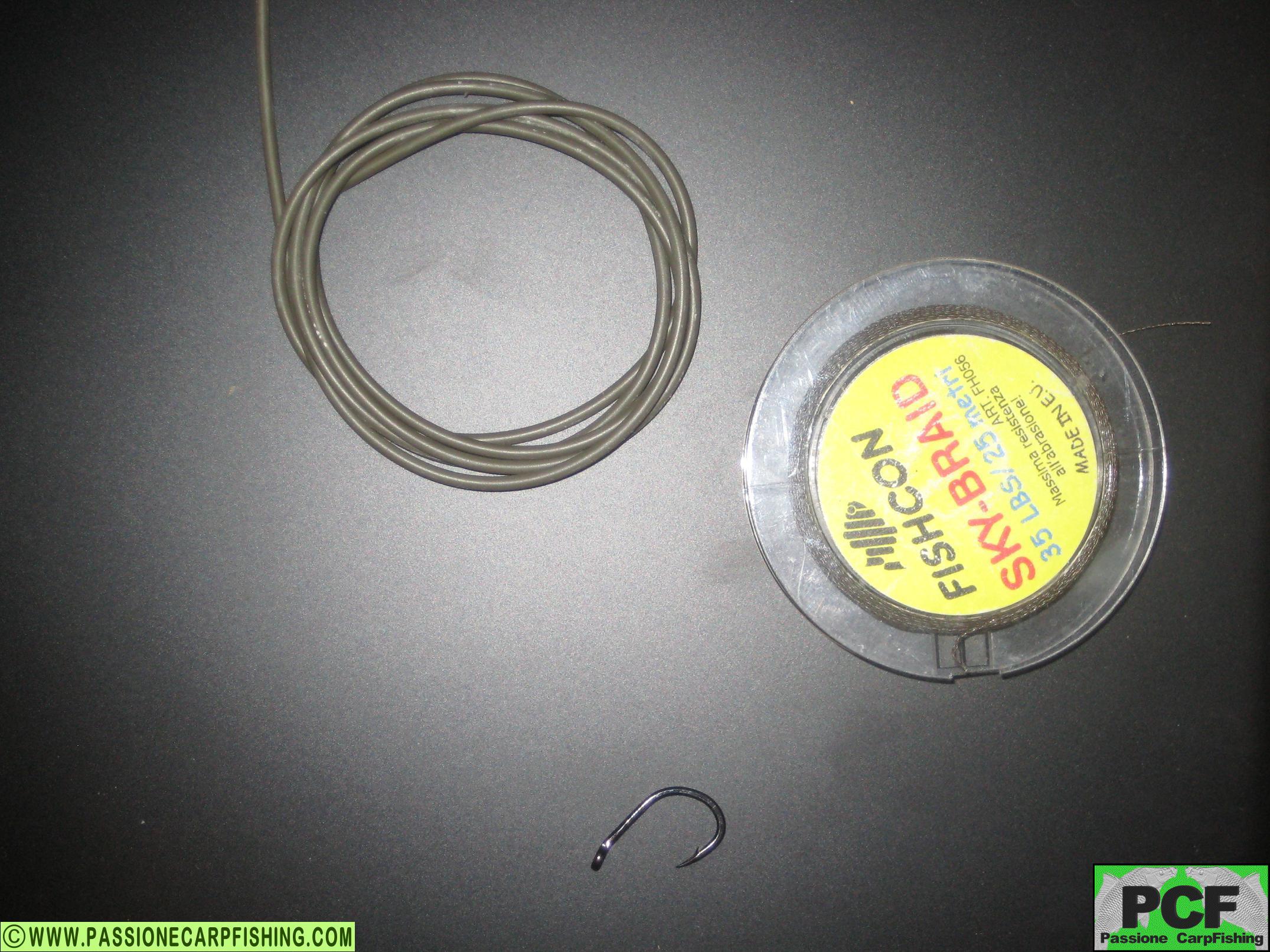 • Tubicino di silicone o termo restringente. 1) Tagliare uno spezzone di filo di 30 cm circa e fare un asola a un capo del filo, dopodiché inserire il filo nell’occhiello dell’amo facendolo passare dall’esterno.