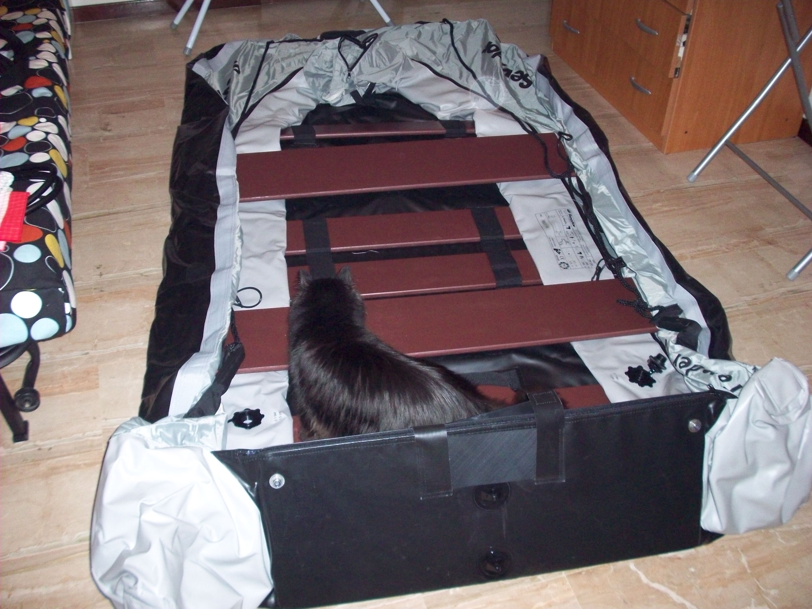 un po di misure: 2,50 x 1,50 portata 340 kg... peso 25 kg circa. 2 camere d'aria coperte da fodera in nylon grigia per proteggerle da spini e rocce il fondo è foderato in triplo strato in nylon..