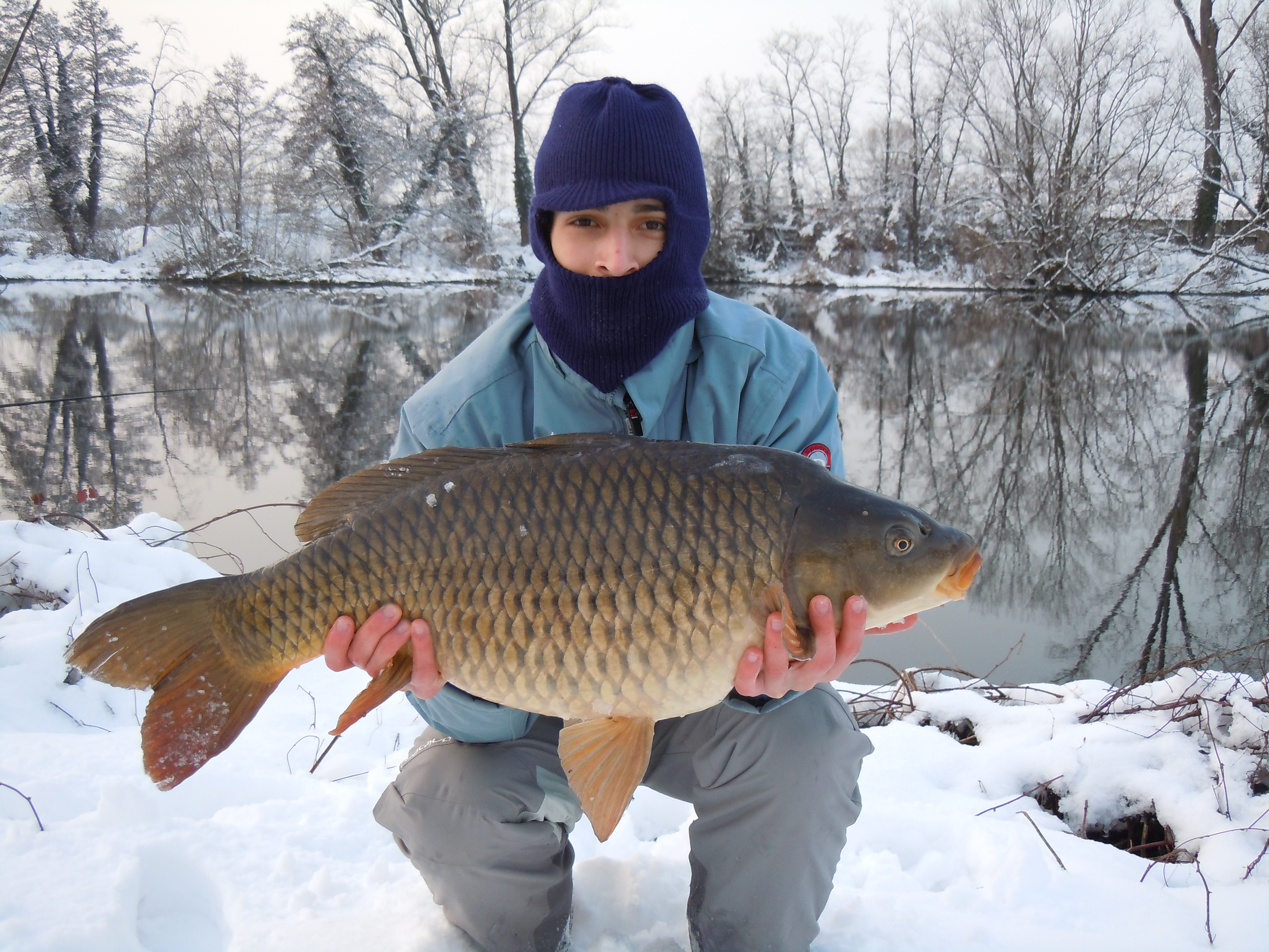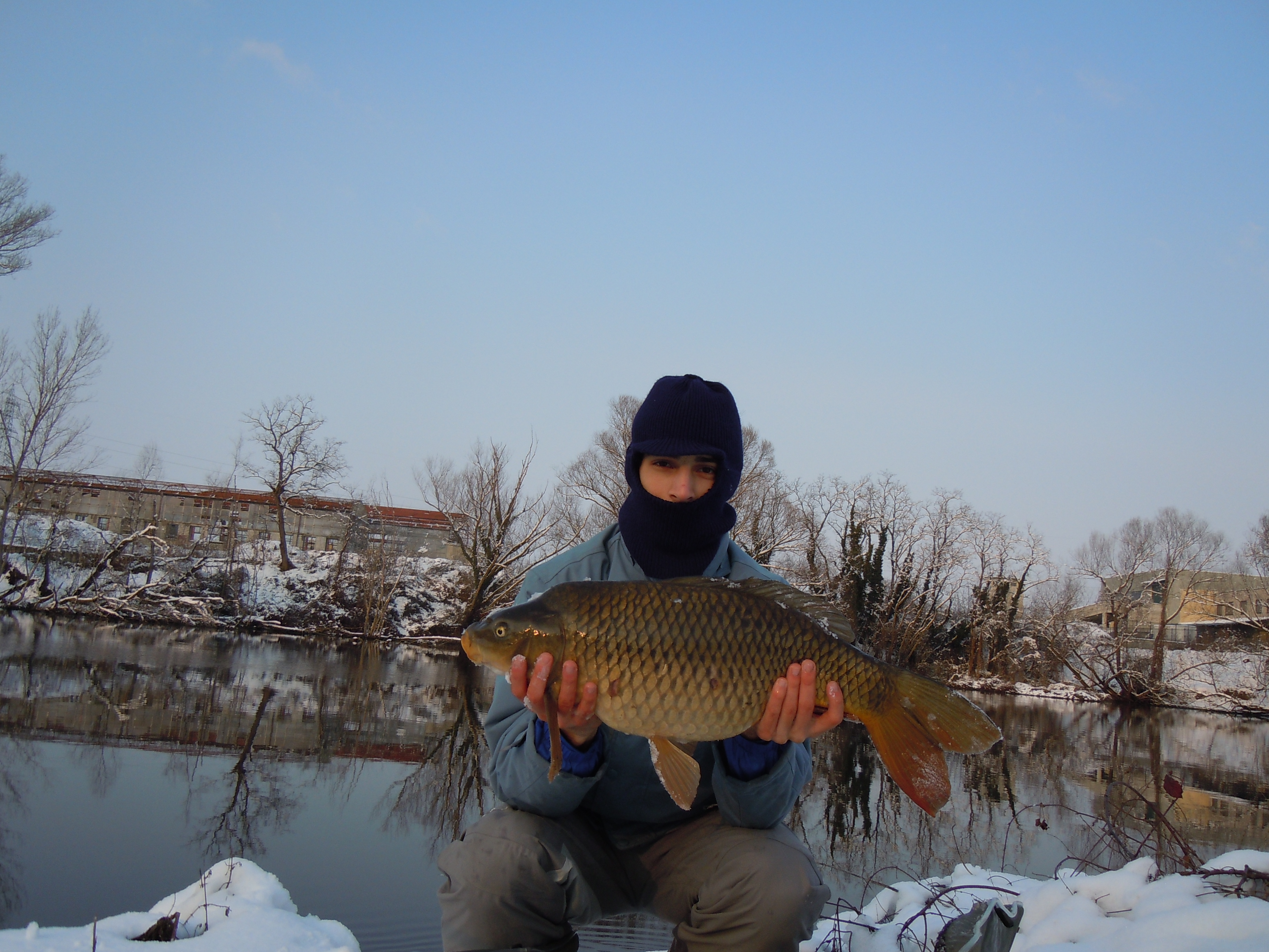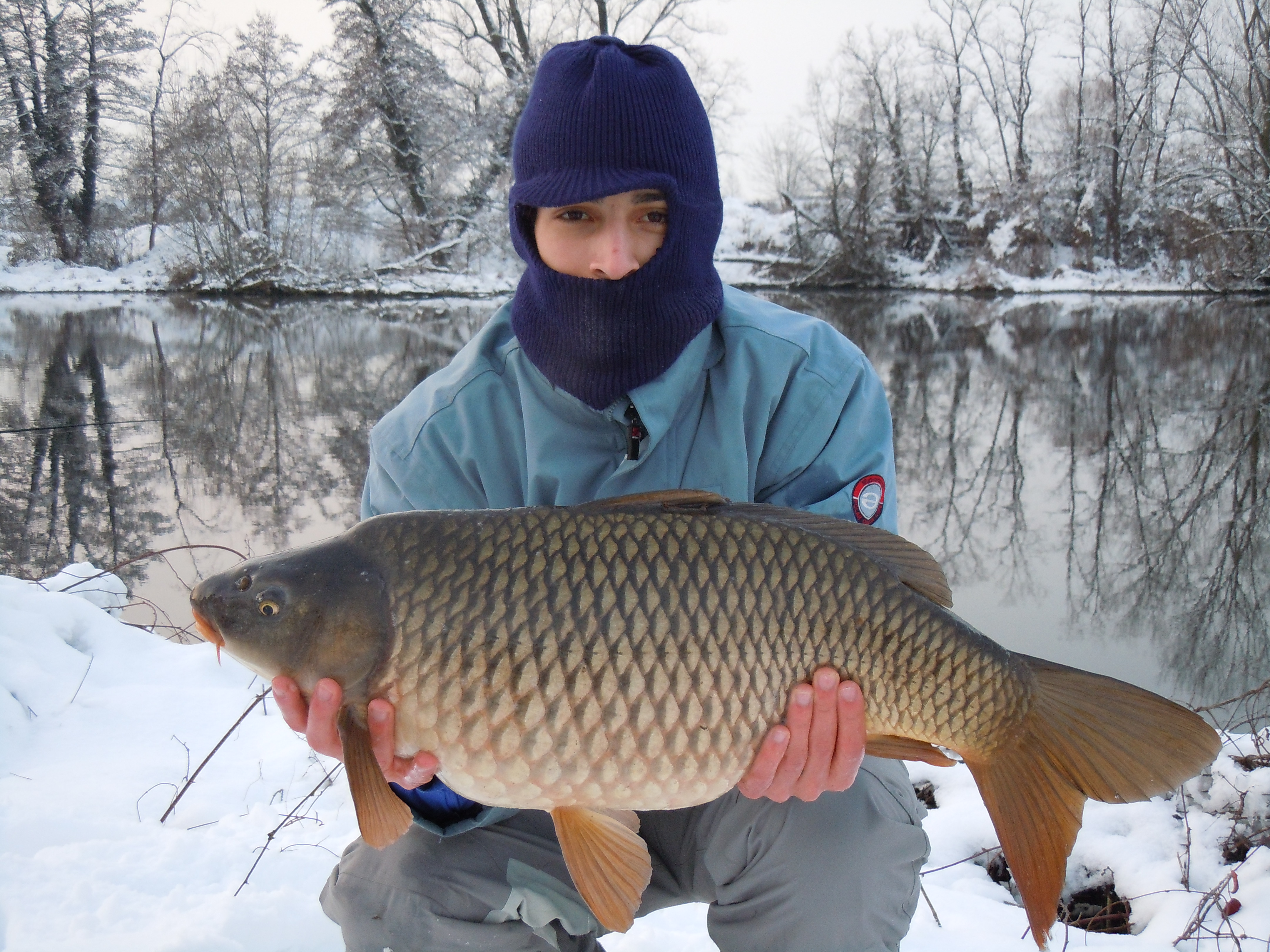 Alle 4 circa ecco la prima partenza: dopo delle finte abboccate sulla canna con innescato il mais, la boiles colpisce. Un bel combattimento che dura per 10 minuti (non pensavo che anche d'inverno fossero così tenaci e combattive): finalmente a guadino una bella regina da 6 kg. Sono davvero soddisfatto considerato il freddo pungente ma ovviamente continuo l' azione di pesca innescando 2 canne a boiles. Dalla neve spunta il mio caro nonno che viene a sentire come stavo andando: "una" gli dico "boiles!!". Non passano nemmeno 10 minuti che ne parte un altra: la canna rimbalza sul rod pod, l'afferro e via con un altro combattimento e sta volta ancora più impegnativo. La carpa infatti inizia a nuotare verso valle e siamo costretti a rincorrerla sulla riva per poi salparla dietro una cruva: che bella regina!! In acqua l'avevo stimata sui 6 o 7 kg ma una volta nel retino mi rendo conto che è più pesante: alla pesa sono 9.5 kg !! Ma proprio mentre è ancora sul materassino sento uno z z z z z z z z z prolungato: mi volto e vedo l'altra canna che rimbalza violentemente sul pod. "Non ci posso credere!": dopo averla ferrata passo la canna a mio nonno e mi appresto a liberare l altra. Altro bel combattimento con un' altra regina del Lambro e altri 9 kg di pesce...